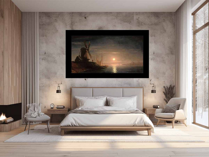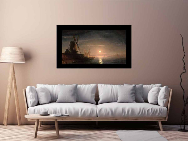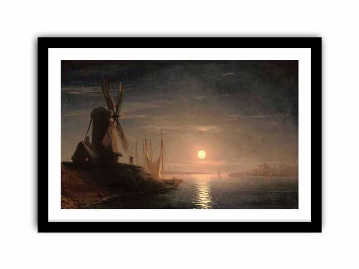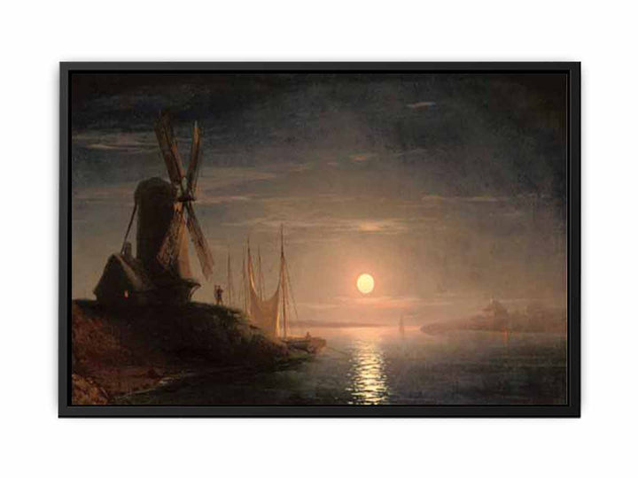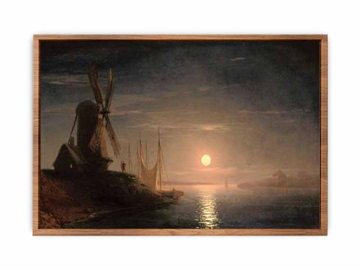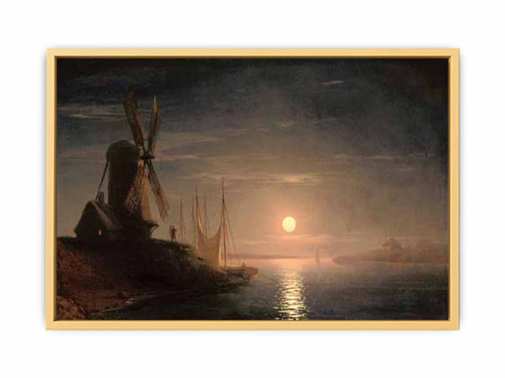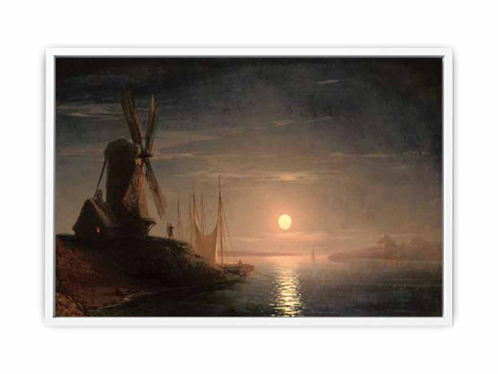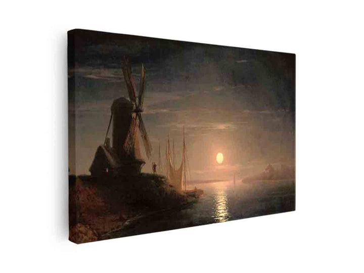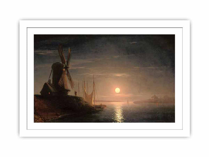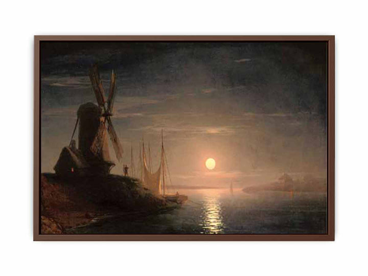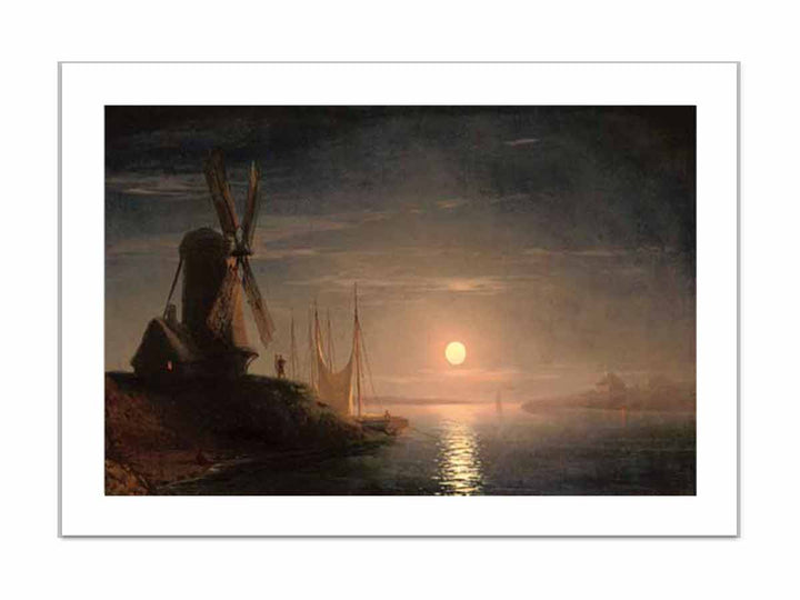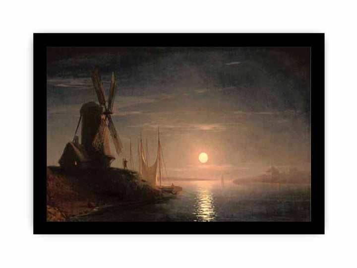 A windmill overlooking a moonlit bay
