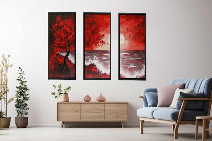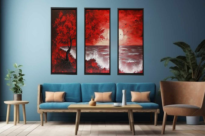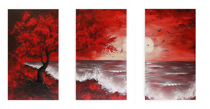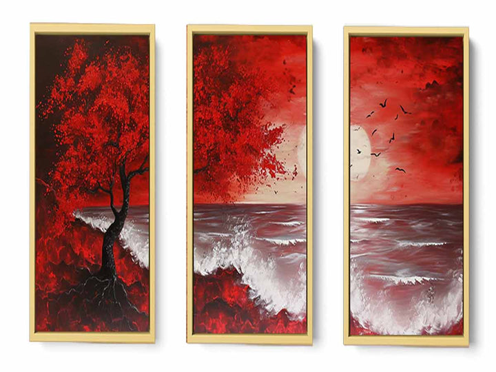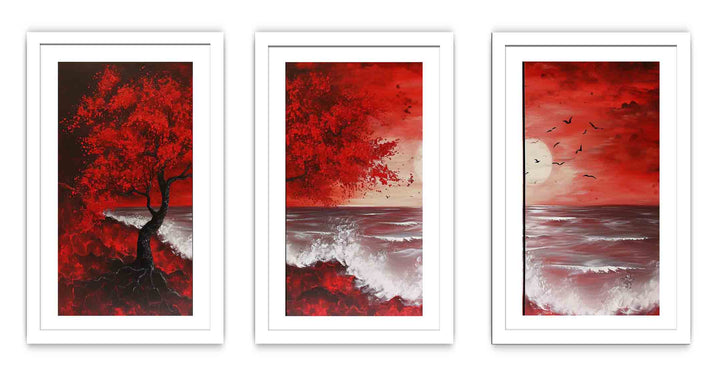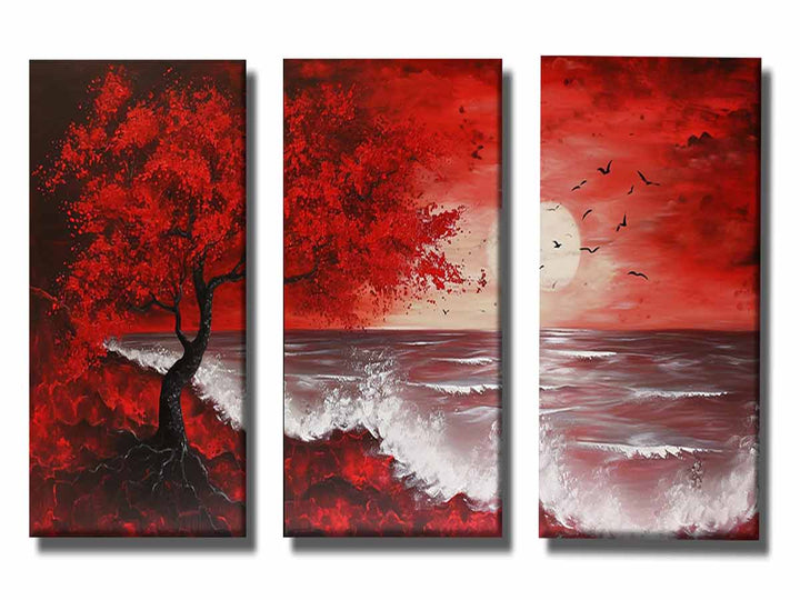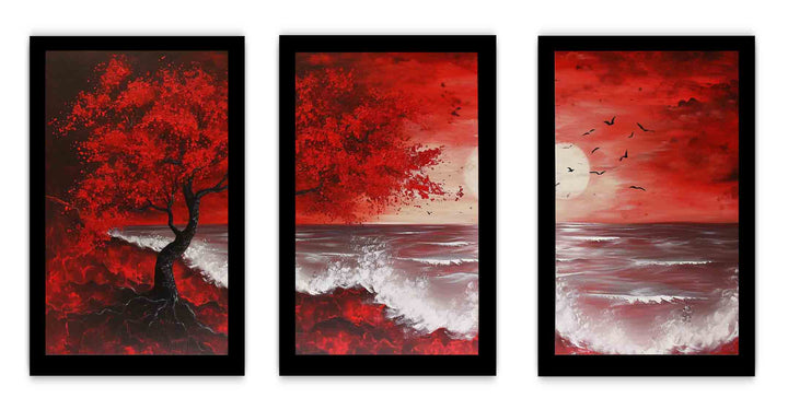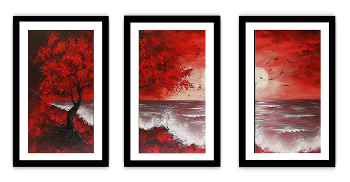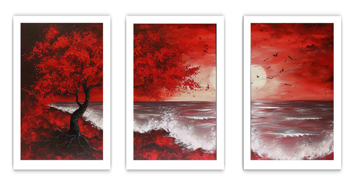 Red Beach Art Painting Set of 3 ( 3 Piece Set)